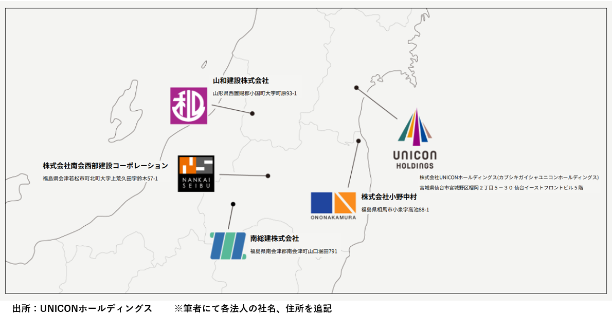 エンデバー・ユナイテッドは、2020年以降、現在傘下となる、山和建設株式会社(山形県)、株式会社小野中村(福島県相馬市)、株式会社南会西部建設コーポレーション(福島県会津若松市)の全株式をそれぞれ取得して子会社としており、ユニコンHD発足後に、南会西部建設コーポレーションが、南総建株式会社(福島県南会津郡)の全株式を買い取ることで、2023年1月、ユニコンHDは地場建設会社4社を束ねる「地域連合型ゼネコン」となりました。