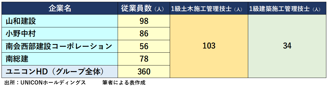 2025年6月現在で、ユニコンHDグループ全体では360人の従業員が在籍しており、建設技術者のうち、1級土木施工管理技士が103人、1級建築施工管理技士が34人という状況です。