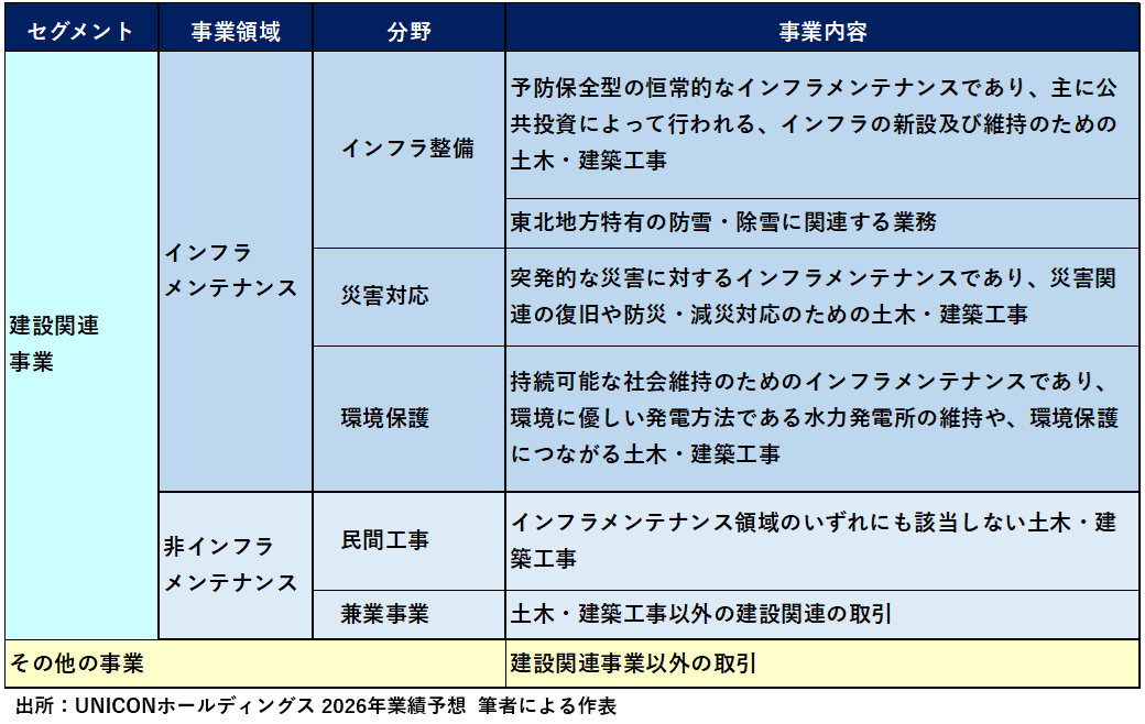 ユニコンHDは、建設関連事業とその他事業の2つの事業セグメントを展開しており、建設関連事業は、大きく「インフラメンテナンス」と「非インフラメンテナンス」と2つの事業領域分かれ、「インフラメンテナンス」は「インフラ整備」、「災害対応」、「環境保護」の3分野に、「非インフラメンテナンス」は「民間工事」、「兼業事業」に2分野に分かれます。これら扱う事業領域、事業分野などをまとめたものが下表となります。