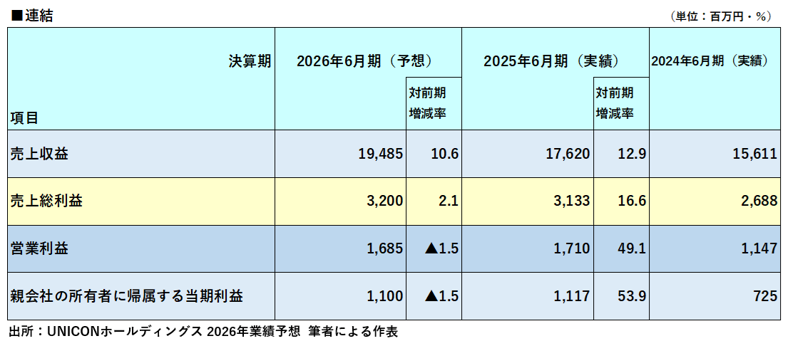 ユニコンHDでは決算期を年度6月としており、今回の東証上場に先駆け、2026年6月期(2025年7月1日~2026年6月30日)のグループ連結業績予想を公表しました。下表はその内容から抜粋して作表したものです。