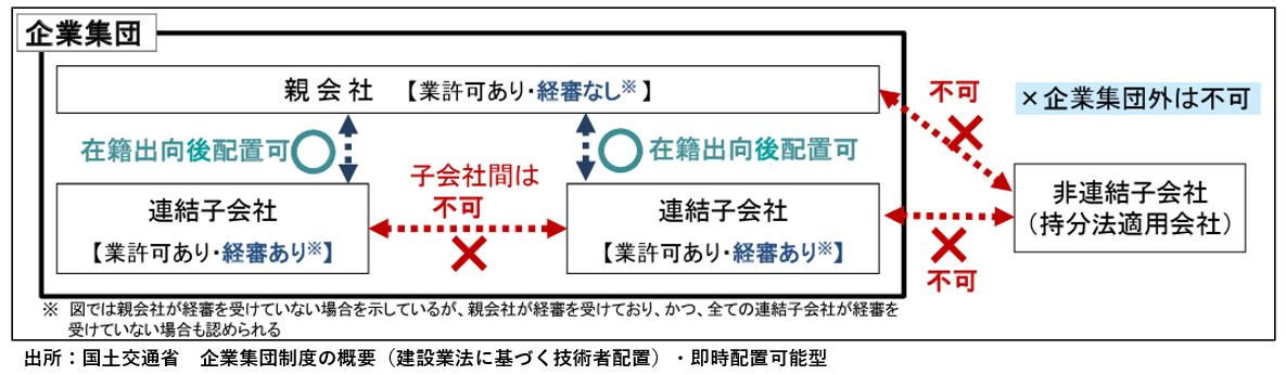 建設工事の適正な施工の確保のため、主任技術者、監理技術者及び監理技術者補佐については、それぞれが所属する建設業者と直接的かつ恒常的な雇用関係を有することが必要とされていますが、「企業集団制度」は特例として親会社及びその連結子会社間の在籍出向社員を、グループ内で即時配置可能とする制度です。