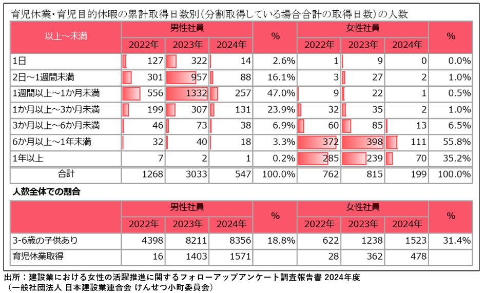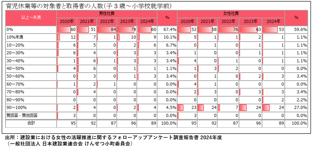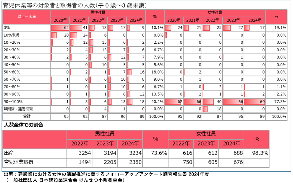 一方で、男性社員の育児休業取得率は73.6%に達し、2380人が取得しているほか、取得率90%以上100%の企業が20.2%あり、建設企業で男性の育児休暇取得が積極的に推進されていることがわかりました。