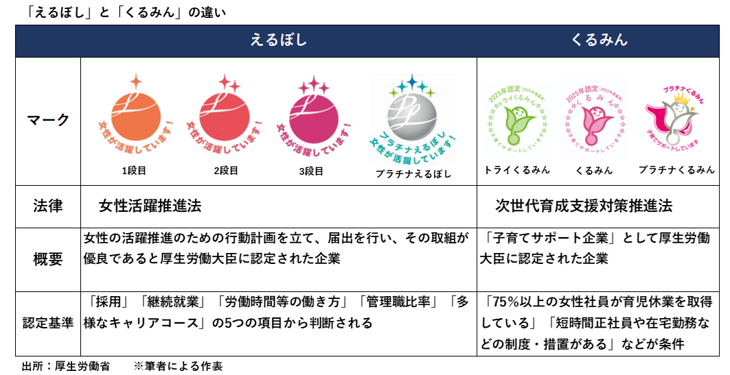 えるぼしマークには、認定段階に応じた3種類とプラチナえるぼしマークがあり、くるみんマークには、同様に、トライくるみん・くるみん・プラチナくるみんの3種があり、企業の取組み状況を知ることができる目安となっています。