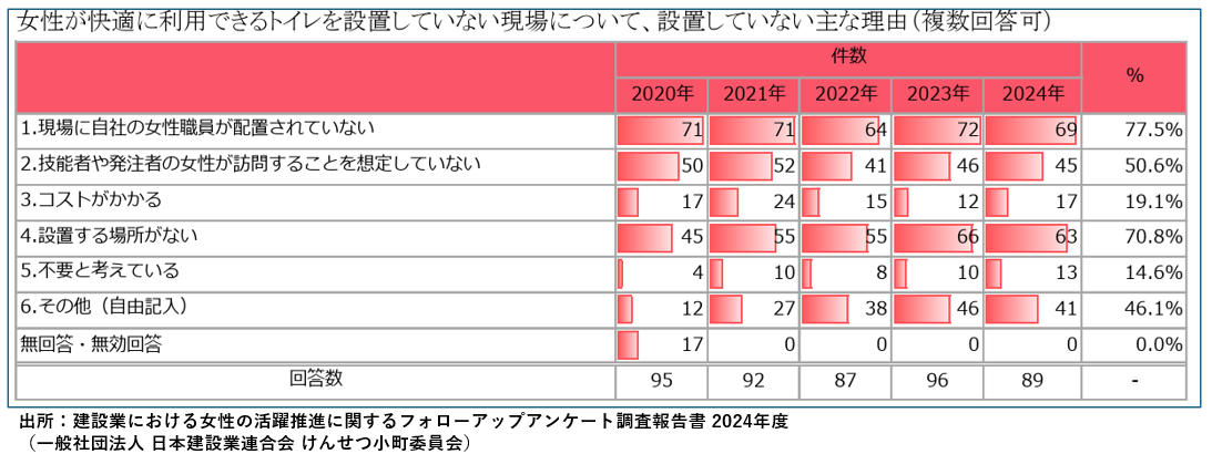 一方、設置していない主な理由としては、「現場に女性職員が配置されていない」が77.5%で最も多く、「技能者や発注者の女性訪問を想定していない」という回答が50.6%あり、現場で女性の活躍が進んでいない企業であることが明らかになりました。