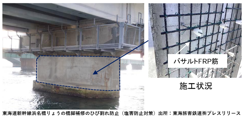 また非腐食性という特長を活かして、特に塩害の影響を受けやすい東海道新幹線浜名橋梁橋脚のひび割れ防止工事に適用していきます。