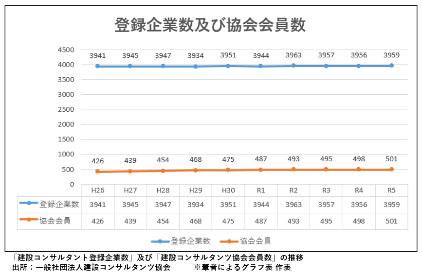 一般社団法人 建設コンサルタンツ協会によると、国土交通省に登録している建設コンサルタントの企業数は2023(令和5)年3月時点で3,959社あり、うち同協会に加盟する会員企業数は504社ということです。