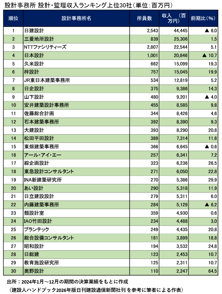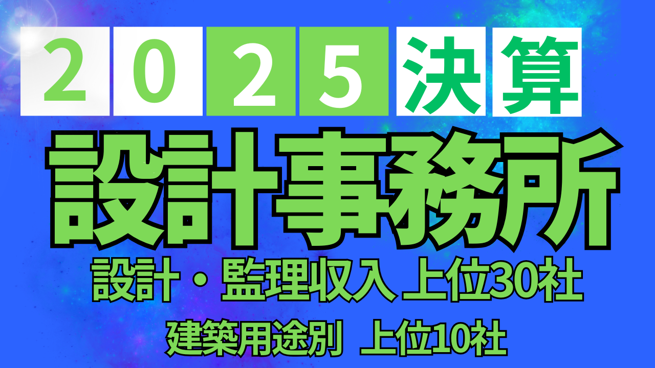 2025年決算業績における設計事務所上位30社の設計・監理業務収入をランキング表としたもの掲載します。