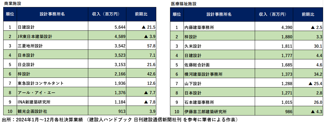 事務所ビル分野の上位5社は変わらず、1位は日建設計(183億円)、2位三菱地所設計(172億円)、3位日本設計(95億円)、4位久米設計(45億円)、5位NTTファシリティーズ(34.5億円)です。