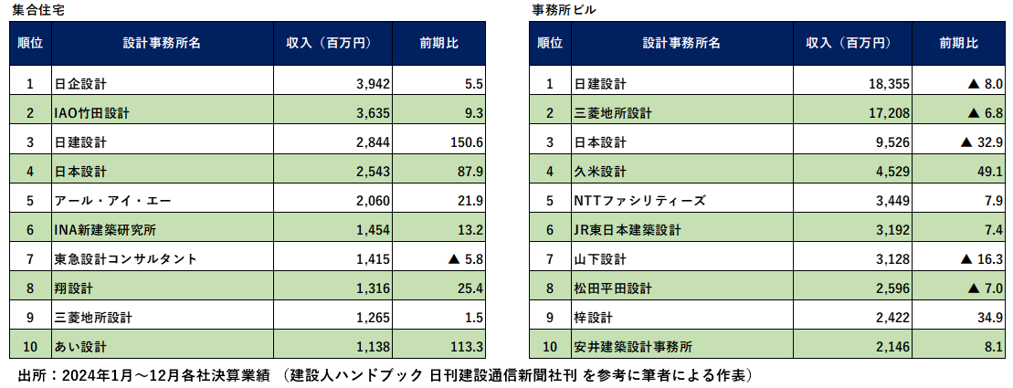 集合住宅分野の設計・監理収入で、日企設計が8年連続1位となりました。同社は再開発や超高層建築に強く、タワーマンションの実績が豊富です。アール・アイ・エーは増収に転じたものの5位へ後退しました。日建設計、日本設計、あい設計は特に前期比伸長が目立ちました。