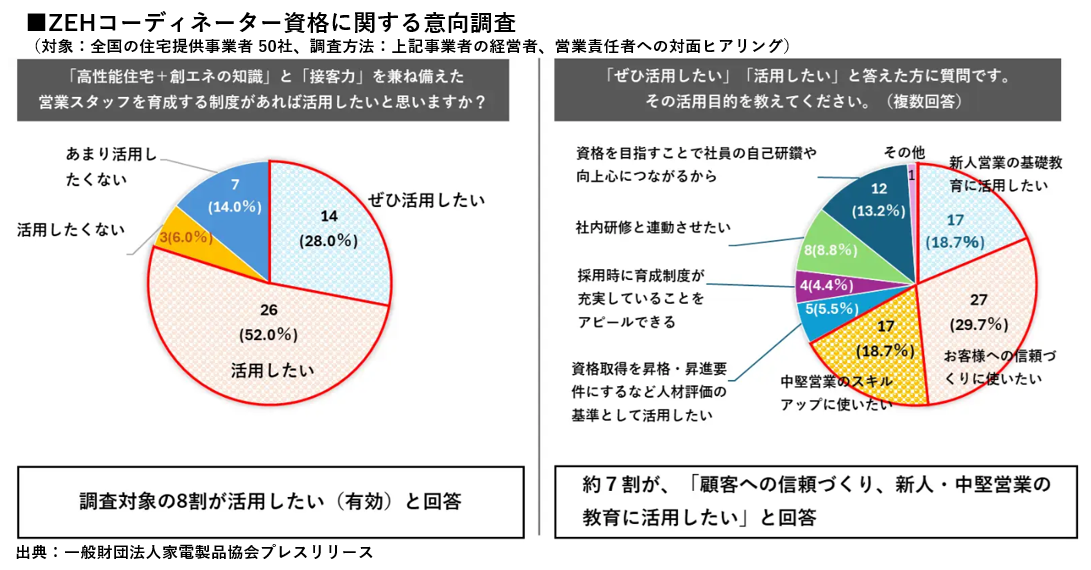 ZEHコーディネーター資格制度を創設した、一般財団法人 家電製品協会は、資格創設の前段階で、全国のZEHビルダーの経営者・営業責任者を対象に「新資格創設をするうえで必要な知見・知識」について事前調査を実施しました。