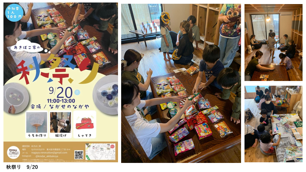 あきばこ家の認知や地域の方々との交流を目的に、ながせのながやで秋祭りを開催しました。多くの子供が参加して、千本引きや紙飛行機飛ばし大会などを行いました。