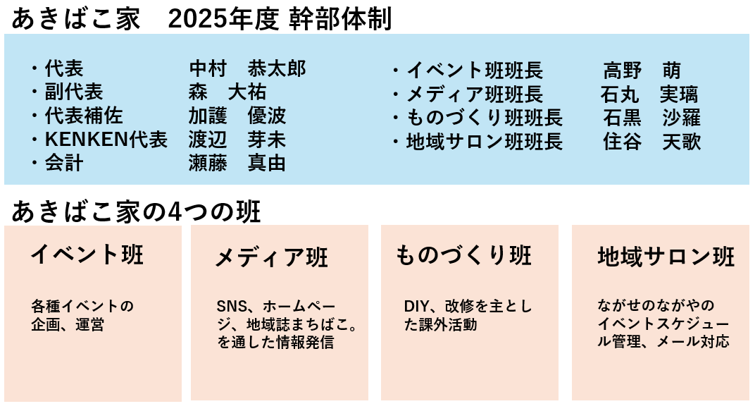 2014年に発足したあきばこ家ですが、設立後2年は浅井駿平さんが初代代表を務めており、2025年度 中村恭太郎さんが10代目代表となるそうです。2016年に竣工した、ながせのながやも竣工後10年目となり、一つの節目を迎えた本年度も、あきばこ家は学生たちによる、新たな挑戦を継続中です!