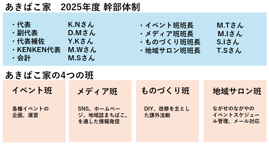 2014年に発足したあきばこ家ですが、設立後2年は初代代表が継続して務めており、2025年度 K.Nさんが10代目代表となるそうです。2016年に竣工した、ながせのながやも竣工後10年目となり、一つの節目を迎えた本年度も、あきばこ家は学生たちによる、新たな挑戦を継続中です!