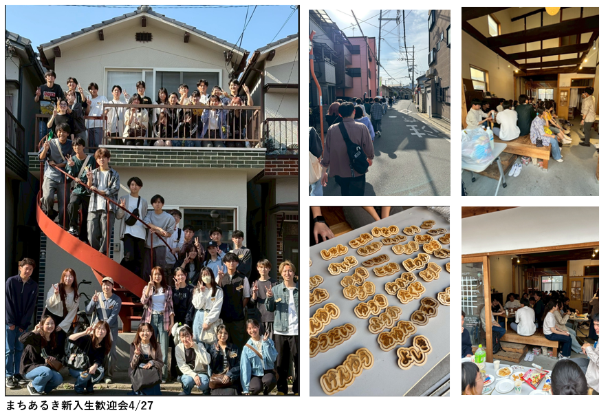 新入生に、これまであきばこ家が行ってきた活動を知ってもらうために、ながせのながや、かみこさかの家、4軒長屋を見て回り、3回生から後輩に改修プロジェクトの説明を行いました。新入生と一緒に参加した上回生にとっても活動をより深く知る機会となり、飲み物やお菓子などを用意して歓迎懇談会も行い、学生同士の距離が一気に縮まりました。