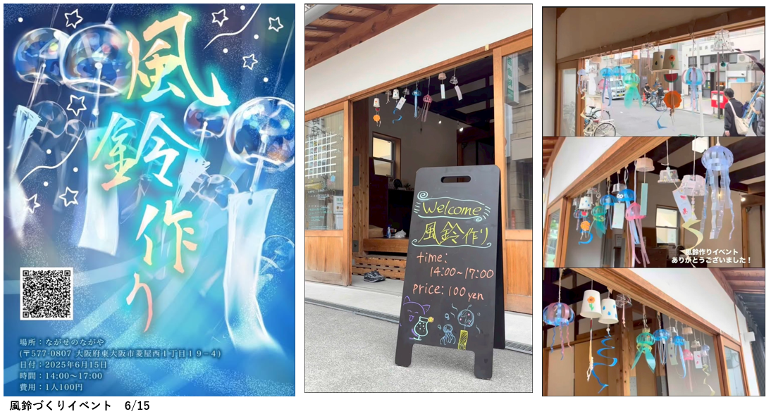6月は本年度メンバーが、地域の人々との繋がりを作り直す第一歩として、イベント班が「風鈴づくりのワークショップ」を企画しました。参加費100円でながせのながや見学と、風鈴づくりを楽しんでいただける企画です。ながせのながやでは、定期的に催しを行いますが、続けることにより再来場いただける人が増えていくことも、私たちのやりがいとなります。