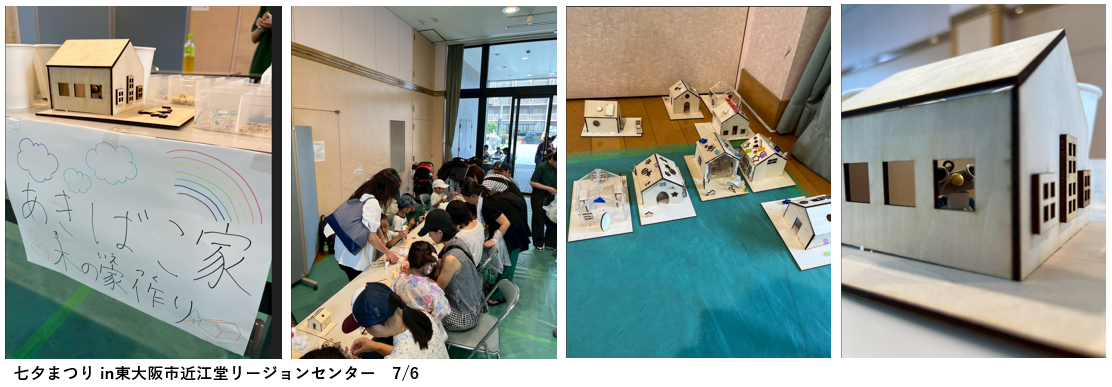 7月は七夕まつりに合わせて、子供たちがものづくりに興味を持ってくれるきっかけとするために、「木の家作り」を企画・開催しました。