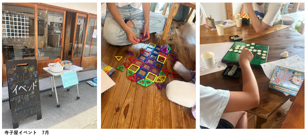 地域の子供たちと交流を深め、ながせのながやの存在を知ってもらうため、定期的に寺子屋イベントを実施しています。7月はお菓子を準備して、縁日スタイルで実施し、参加した小学生は、なつやすみの宿題をしたり、ゲームで遊んだりしました。