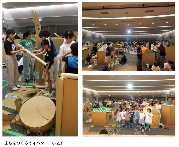 イベント企画には、あきばこ家OBでフーシャ代表の浅井駿平さんが関わり、参加大学も近畿大学だけではなく、大阪公立大学、摂南大学、滋賀県立大学、関西大学、神戸大学などから多数学生が運営参加し、イベントでは、子供たちに段ボールで家を作ってもらい、それらを集めてまちを形成するというものです。