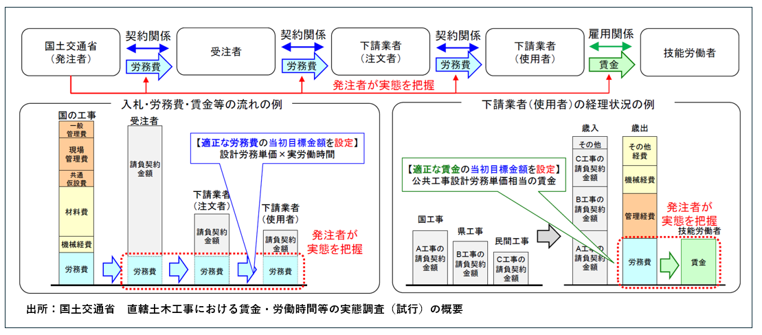 これらの規定を背景に、賃金ダンピングを抑止し、健全な競争環境を実現することや、技能労働者への賃金支払いを把握して、適正賃金を確保し、品質確保の担い手を確保する目的で実態調査が試行されることになりました。