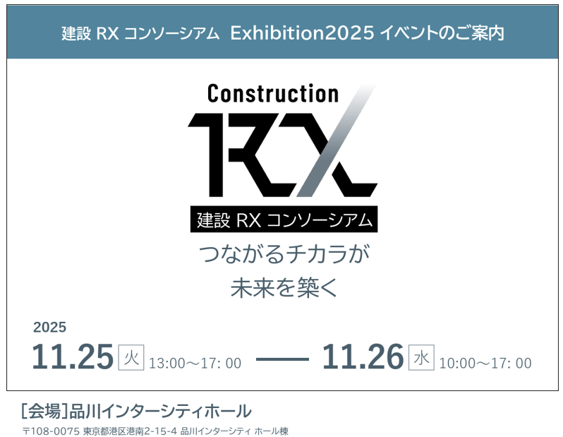 2025年11月25日、26日には、品川インターシティホールで、「建設RX コンソーシアム Exhibition2025 イベント」を開催します。
