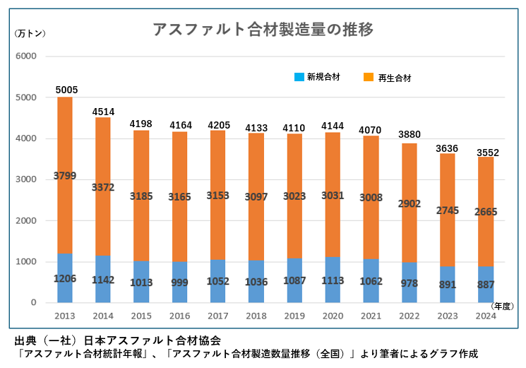 一般社団法人日本アスファルト合材協会の調査結果によると、2024年度のアスファルト合材製造量(会員合計)は、前年度比2.3%減の3552万トンで4年連続の減少となりました。(下グラフ)
