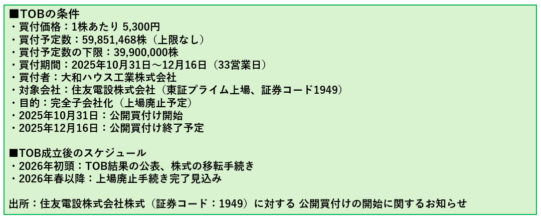 大和ハウス工業による住友電設の株式公開買付け(TOB)は、2025年10月31日に開始されました。その概要は下表の通りです。