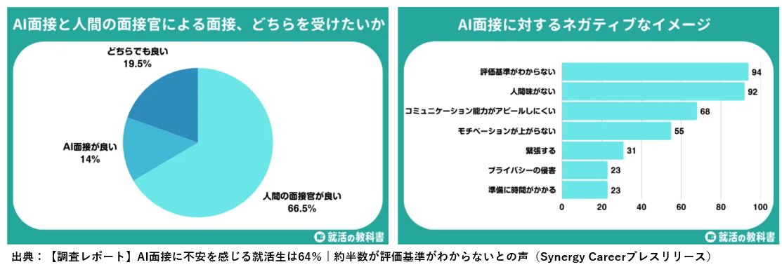 出典:【調査レポート】AI面接に不安を感じる就活生は64% | 約半数が評価基準がわからないとの声(Synergy Careerプレスリリース)