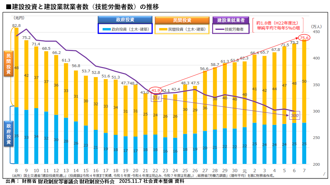 2025年度の建設投資見通しは75.6兆円で、2010年度の41.9兆円に対して、約1.8倍に増大しており、単純平均で年5%増大していますが、技能労働者数は331万人から300万人に減少しており、建設業の人手不足が深刻化しています。