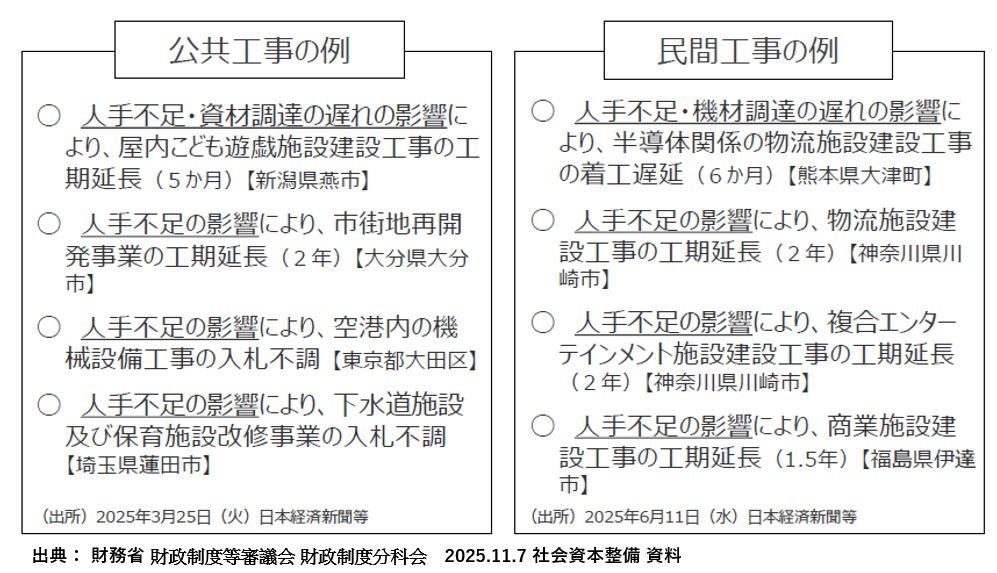 さらに、財務省は人手不足の影響などにより、工事の遅れが相次いでいるとして、公共工事では市街地再開発事業(大分市)の工期2年延長など4例を、民間工事では物流施設建設(川崎市)の工期2年延長、商業施設建設(福島県伊達市)の工期1年半延長など4例を挙げました。