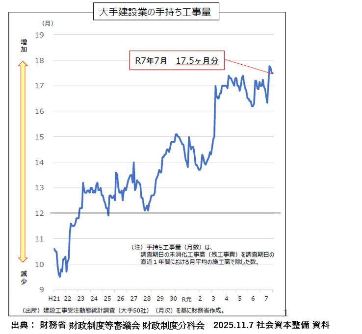 また「未消化の工事」が増大していることについて、大手建設業50社の手持ち工事量を示し、手持ち工事量が2021年に急増して以降、17カ月程度で推移し、2025年7月現在は17.5カ月分となることを示しました。これは現状ペースで進行すれば、全工事を消化するのに17.5カ月必要であることを意味しています。