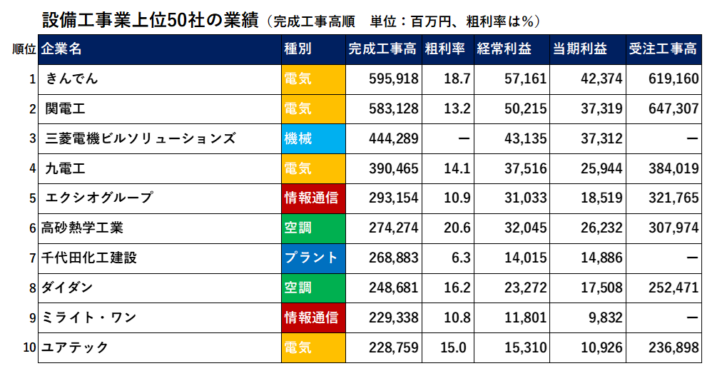 完工高トップ3には、きんでん、関電工、三菱電機ビルソリューションが名を連ね、上位50社のうち、41社が前期実績を上回るなど好調な決算業績でした。