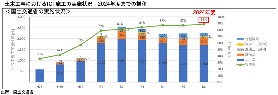 2025年度から、「土工」「浚渫工(河川)」「浚渫工(港湾)」の3工種で、ICT施工原則化がスタートしています。この3工種は、2024年度においてもICT施工の実施率や実施件数が高く、国土交通省直轄工事では約9割でICT施工が実施されており、都道府県・政令市でもICT施工原則化が可能と思われる工種から適用を進めた経緯となります。