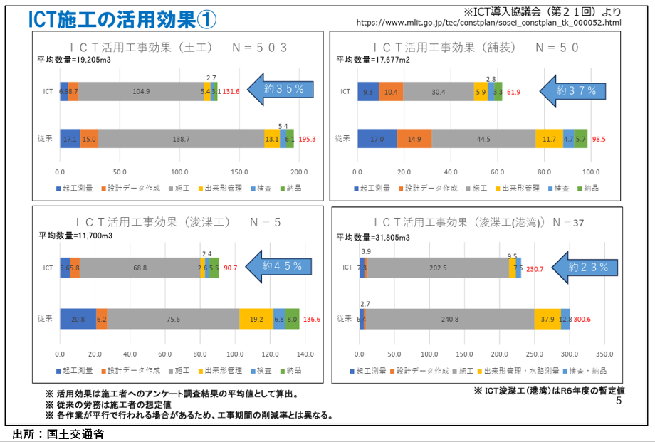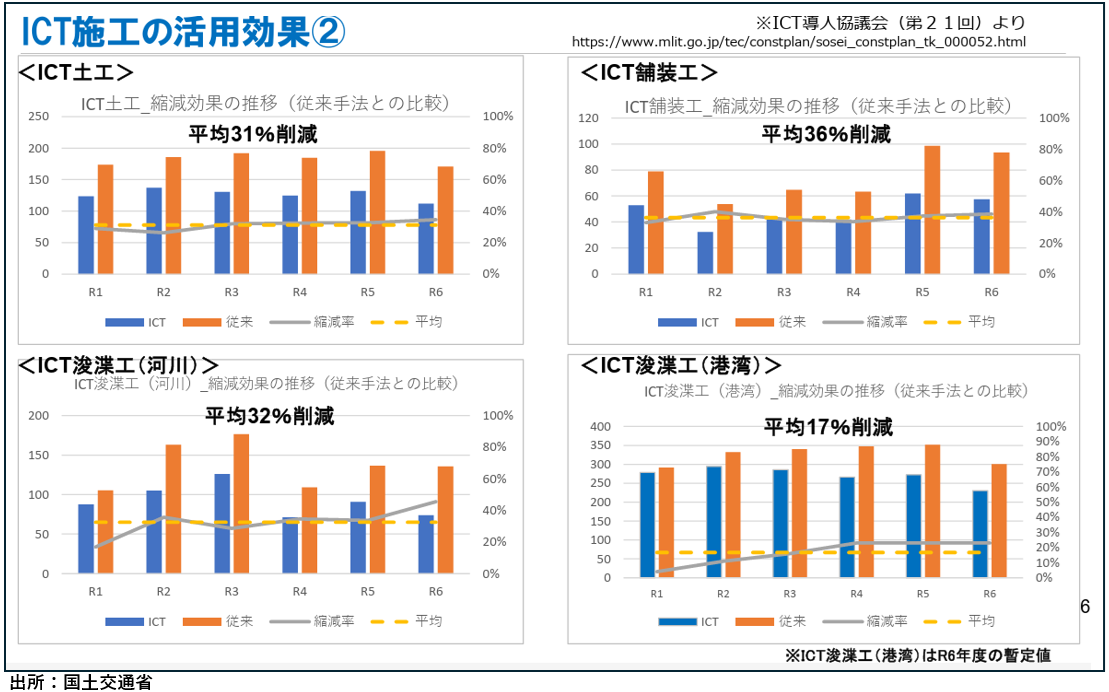 縮減効果は、過年度からの推移を見ると、ICT土工及びICT浚渫工(河川)においては縮減効果が約3割程度出ており、ICT舗装工においては約3.5割程度で横ばいとなっています。ICT浚渫工(港湾)では縮減効果が増加傾向で、近年2割以上の縮減効果が見られています。