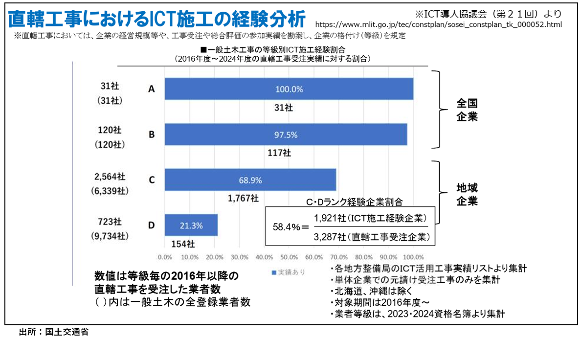 下図は2024年度までの「直轄工事におけるICT施工の経験分析」ですが、全国大手企業となるAランクで100%、同準大手中堅のBランクでは97.5%がICT施工を経験済みです。