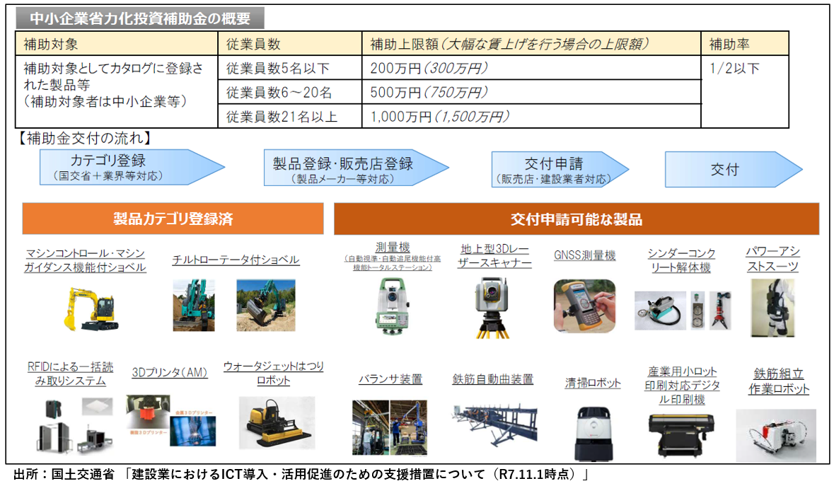 国土交通省では、「建設業におけるICT導入・活用促進のための支援措置について(2025年11月1日時点)」として、中小建設業者によるICT化に有効な製品を、「中小企業省力化投資補助金(中企庁所管)」の補助対象に追加することを公表しました。