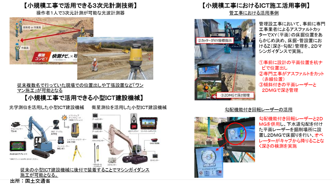 下図は、小規模建設工事に対応したICT施工機器およびICT建機の具体例です。