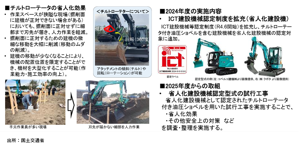 狭小な現場での掘削や小規模土工では、手作業が発生していますが、小型ICT建機で対応ができるように、2025年度からは省人化建設機械として認定された型式を活用し、チルトローテータ付き油圧ショベルの省人化効果などを調査・整理しています。