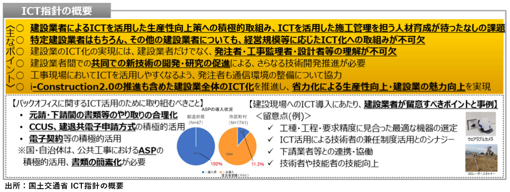 2024年12月には、「情報通信技術を活用した建設工事の適正な施工を確保するための基本的な指針(通称:ICT指針)」が公表されました。その内容は下記の通りです。