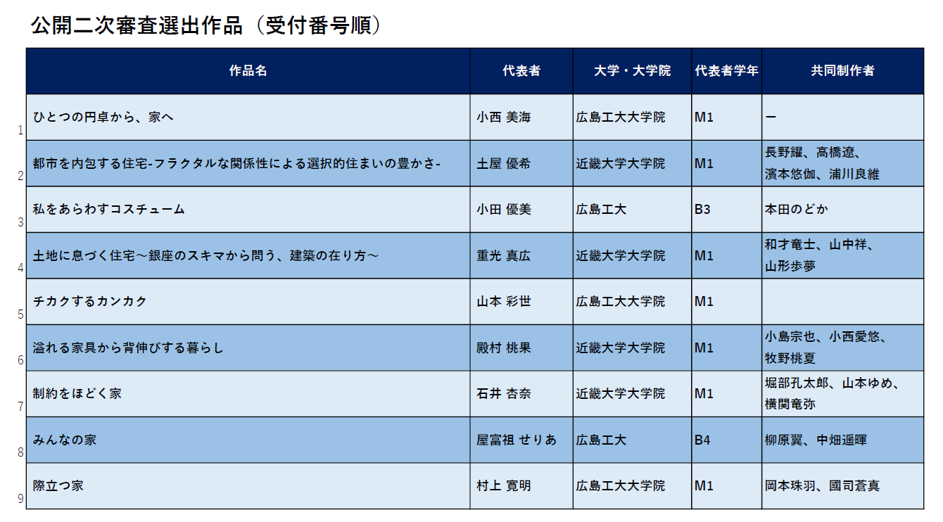 審査会に先んじて、11月10日に一次審査結果が発表されました。下記9作品が選出され、公開審査に進むことになりました。