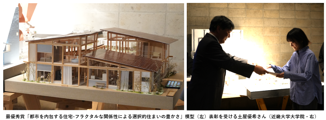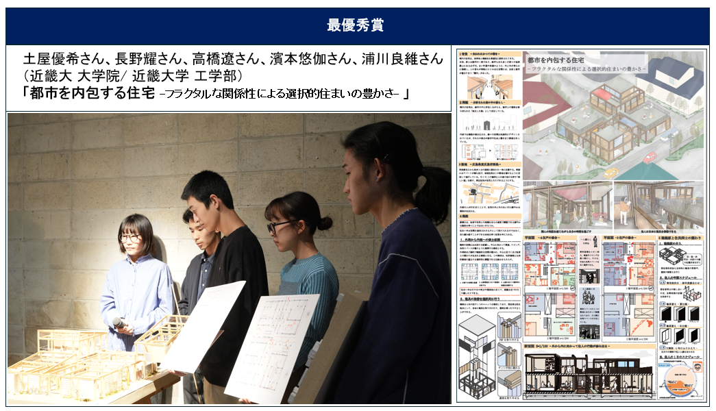 最優秀賞に選ばれたのは、近畿大学工学部大学院1年生の土屋優希さんと、長野耀さん、高橋遼さん、濱本悠伽さん、浦川良維さんのグループによる「都市を内包する住宅-フラクタルな関係性による選択的住まいの豊かさ-」となりました。