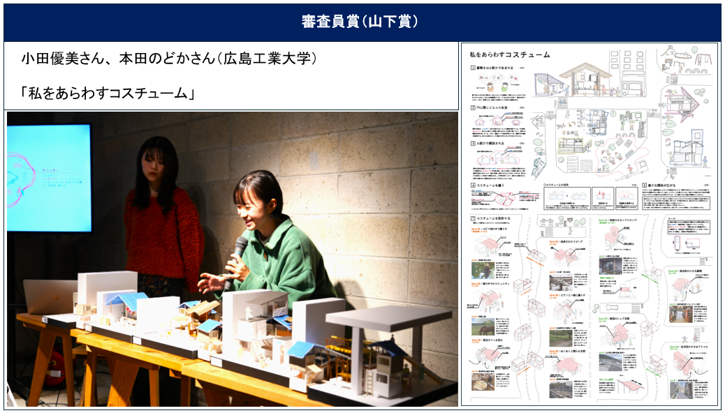 当初、優秀賞は2点の予定でしたが、もう1点の優秀賞を選ぶ過程で、山下審査員が推す「私をあらわすコスチューム」と、カン審査員が推す「みんなの家」が候補となりましたが、甲乙つけがたく、審査評価を重視すべきとの意見により、優秀賞は1点として、学部生によるこの2作品を審査員賞に決定しました。