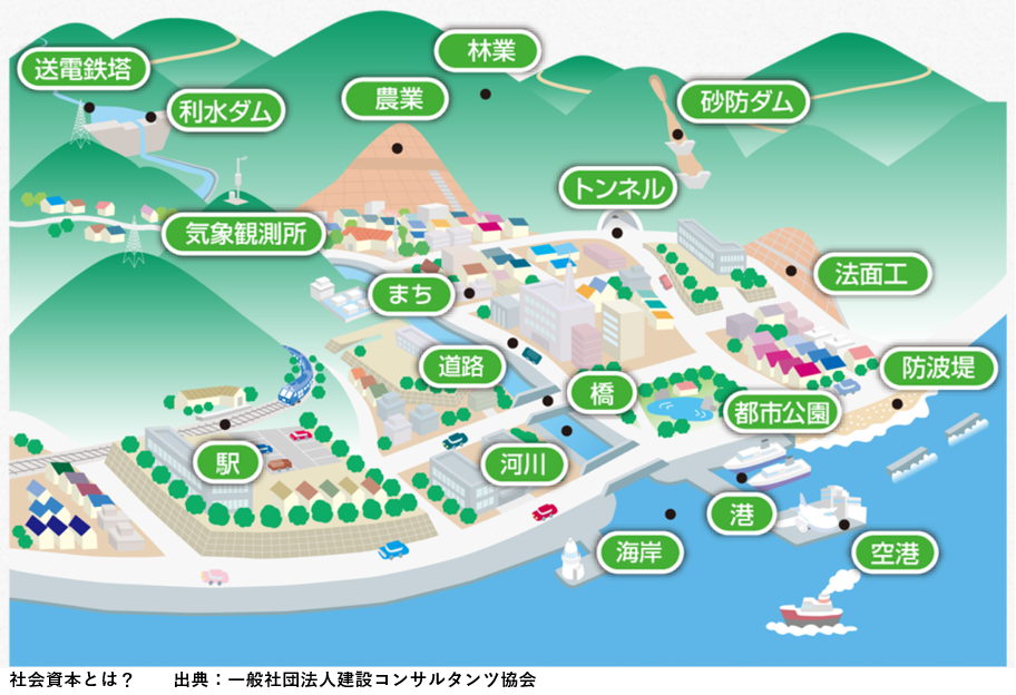 下図は代表的な社会資本(インフラ)を図示したものです。