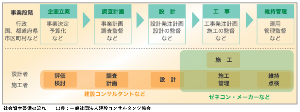 これら社会資本整備(インフラの建設)は、公平性・透明性の観点から、設計と施工を別の事業者で分担することがルール化されてきました。