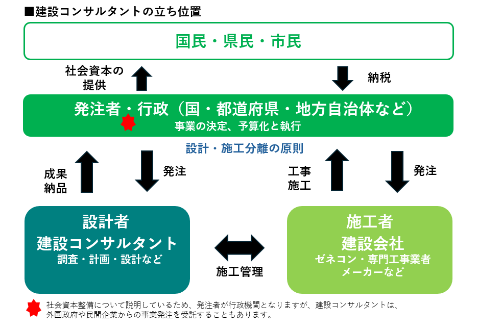建設コンサルタントは、実際に建設工事を行う「建設業」とは異なり、企画・設計・管理を中心とする技術サービスを提供する「サービス業」に分類されています。
