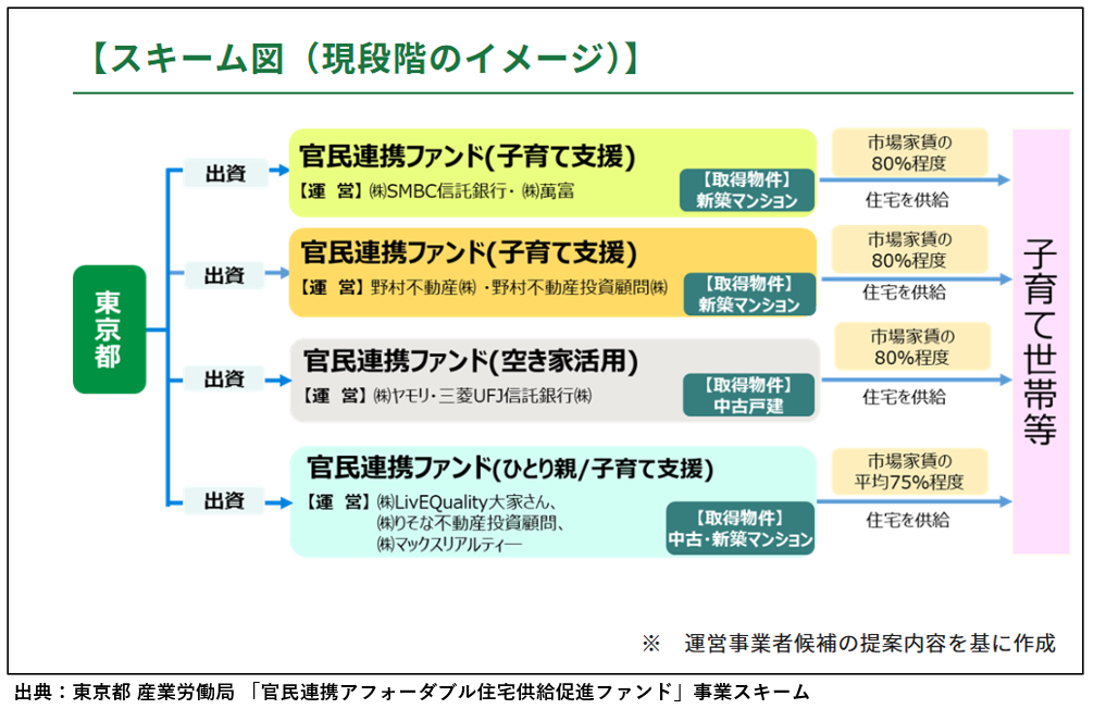 2025年11月7日、東京都は、「アフォーダブル住宅」を供給する官民連携ファンドの運営事業者候補として、野村不動産やSMBC信託銀行などが入る4グループを採択したことや、「官民連携アフォーダブル住宅供給促進ファンド」の事業スキームを発表しました。(下図)