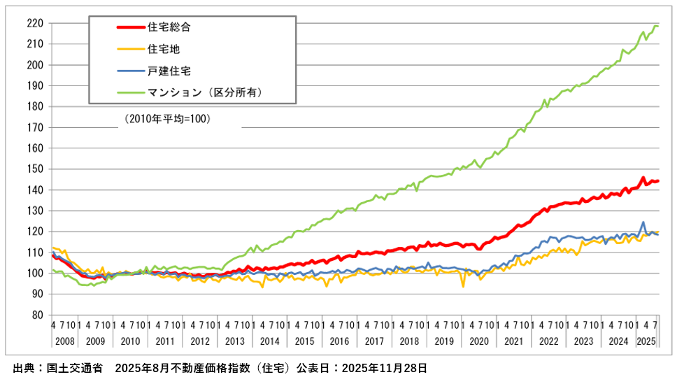 その中で不動産価格も近年大きく上昇を続けているのです。下グラフは、国土交通省が発表している最新の不動産価格指数です。(2025年12月15日現在)