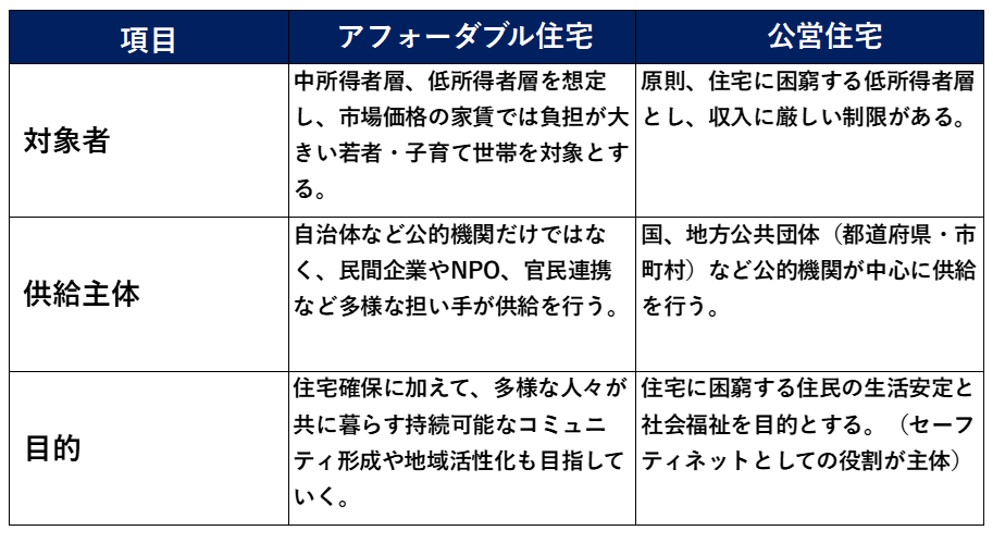 公営住宅とアフォーダブル住宅には、どのような違いがあるのでしょうか?