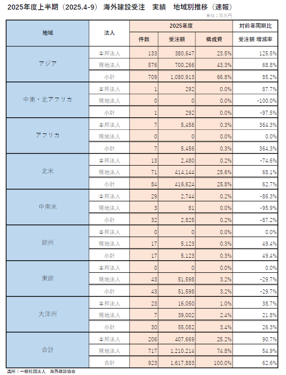 2025年度上半期 海外建設受注は62.6%増の1兆6178億円と過去最高【海外建設協会】