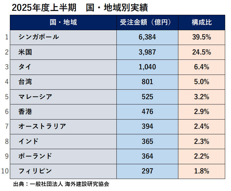 2025年度上半期、海外建設受注額の国別の上位は、シンガポールが受注金額6384億円でトップとなり、2位は3987億円の米国、3位は1040億円のタイ、4位は801億円の台湾、5位は525億円のマレーシアでした。
