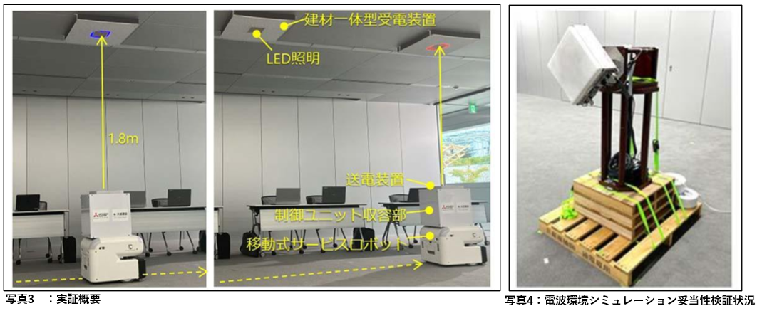 ・実証内容:移動式サービスロボットに搭載した送電装置から、1.8m離れた天井に設置した2台の建材一体型受電装置へ送電。受電量と漏えい電力を計測(写真3参照)